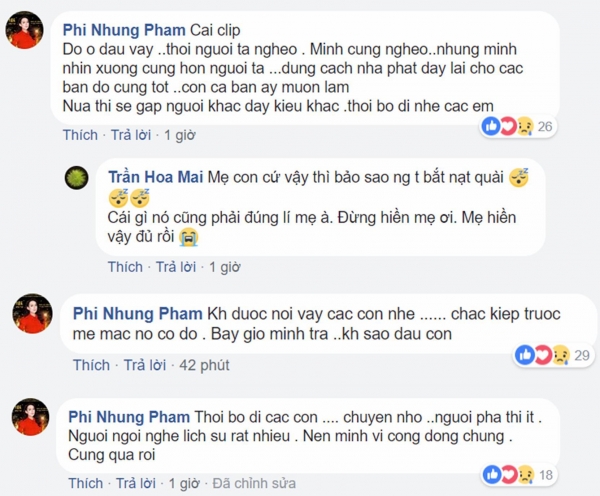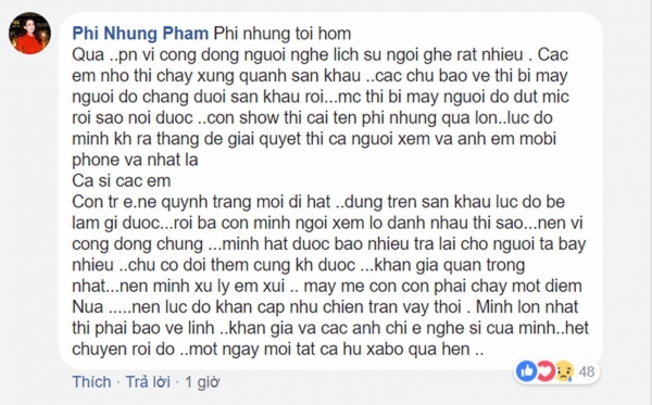 Chia sẻ trên trang cá nhân về vụ việc, Phi Nhung nhận được nhiều lời động viên, khen ngợi vì hành động "nghĩa hiệp" của mình. Cô cho biết mặc dù không tán thưởng hành động "ăn vạ" của vị khách, nhưng vì mọi người, vì những ca sĩ trẻ đứng trên sân khấu, vì cộng đồng chung, khán giả quan trọng nhất nên mình xử lý êm xuôi.