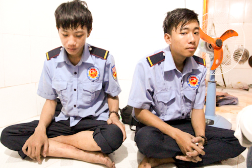 Hai bảo vệ trẻ ngồi thẫn thờ trong phòng trọ, chiều 23/3. Chân tay, mặt mũi họ lấm lem tro bụi do dập lửa, cứu người thoát khỏi vụ cháy chung cư Carina, quận 8.