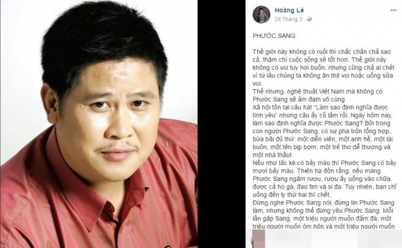 Trong khi đó, với lối văn hài hước nhưng sâu sắc của ḿnh, đạo diễn Lê Hoàng cũng viết về Phước Sang: “Tôi quen Phước Sang từ lâu, lâu lắm rồi, khi Sang c̣n đi xe đạp. Hồi đó là phim “Vị đắng t́nh yêu” tập II, Sang đóng vai một chàng sinh viên nghèo. Bây giờ, tuy h́nh như đă có tiền, Sang đóng vai nghèo cũng vẫn hay.