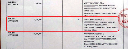 Theo chị Hằng, ngày 30/1, chị chuyển 20 triệu đồng vào số tài khoản 0071000946*** (tài khoản thuộc Ngân hàng Vietcombank, chi nhánh TP HCM) để đặt mua hàng. Sau đó, chị tiếp tục chuyển tiền lần thứ 2 cho công ty trên số tiền 19.680.000 đồng nhưng do chuyển bằng điện thoại, vội vàng nên chị chuyển nhầm số tiền trên sang tài khoản cùng ngân hàng, chủ tài khoản có tên PHAN VU LINH.