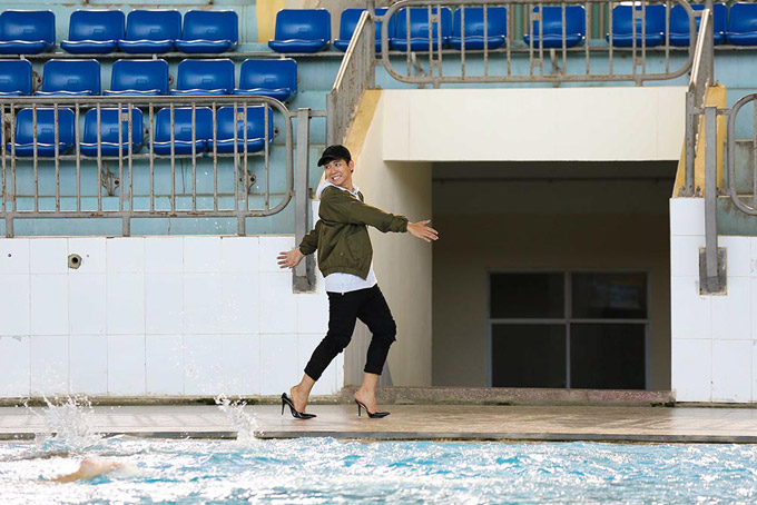 Trong phân cảnh bị ép đi giày cao gót, chạy quanh hồ bơi và công viên, Hoài Lâm đã gặp nhiều khó khăn. Nam ca sĩ kể rằng, trước máy quay anh phải cố kìm nén nỗi đau khi chân bị sưng tấy do giày quá chật. Không ít lần anh còn bị trẹo chân và ngã.