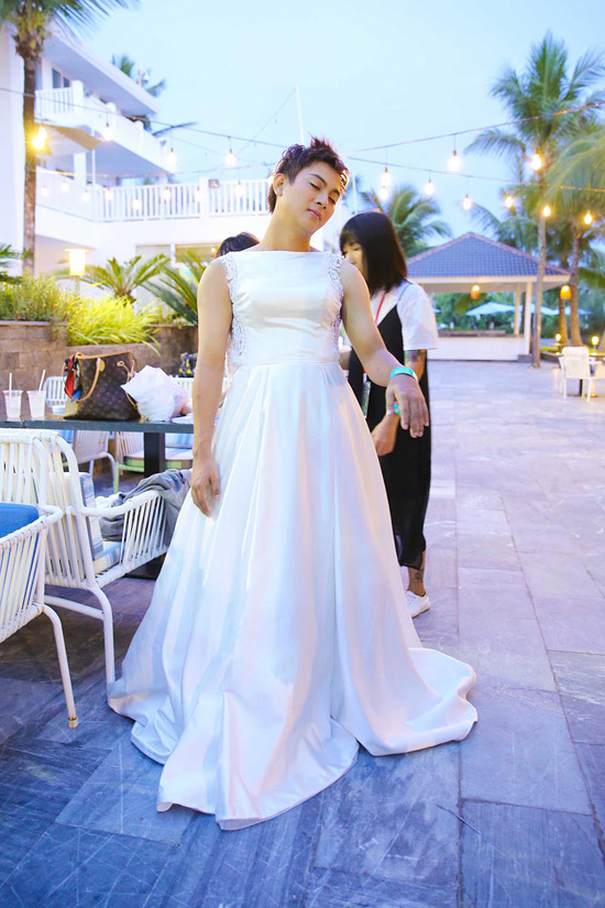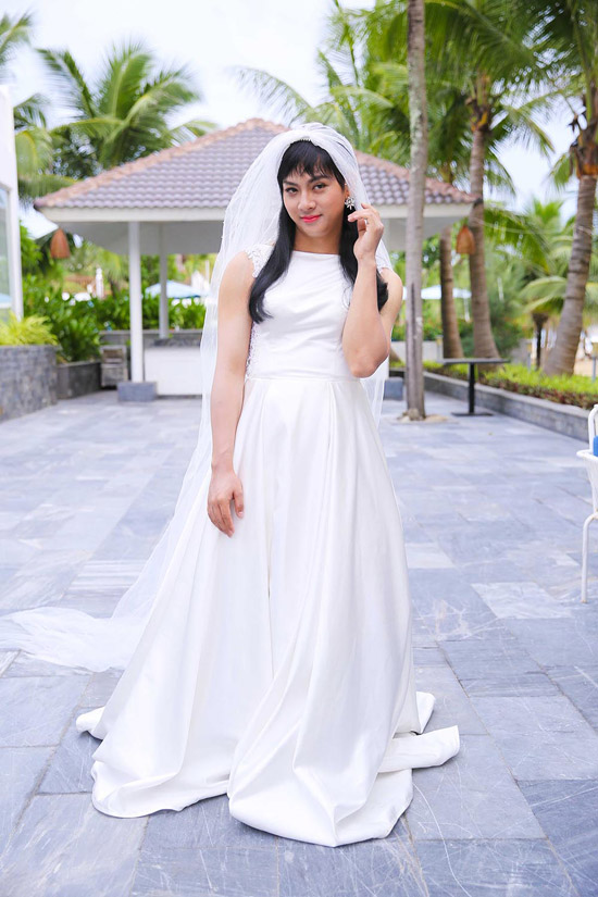 Cũng trong phim, Hoài Lâm còn có cảnh mặc váy cưới, hóa thân thành 'cô dâu' xinh đẹp. Từng giả gái nhiều lần trên sân khấu 'Gương mặt thân quen' nên nam ca sĩ khá thoải mái khoác soiree, đội tóc giả.