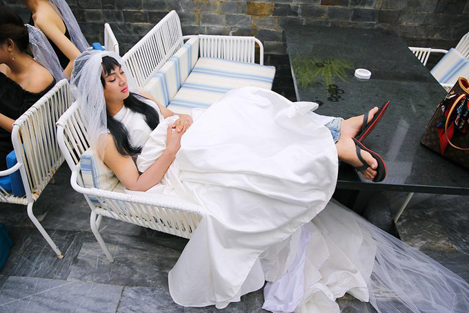 Làm việc trong thời tiết nóng bức, cộng thêm việc mặc váy cưới nhiều lớp, Hoài Lâm 'mệt lử' và ngủ gật ngay trên phim trường.
