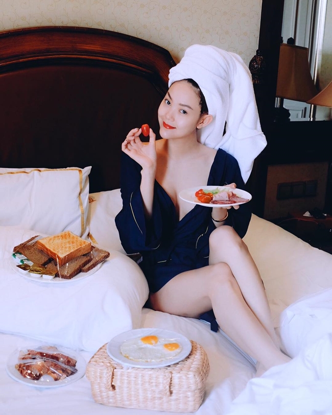 2018 là năm của hot trend mặc áo choàng tắm, đầu quấn khăn, make up kĩ càng tạo dáng "sống ảo". Nếu Hà Hồ quấn khăn tắm đứng ở bể bơi thì Lan Khuê diện đúng mốt với áo choàng tắm, ngồi đọc sách và thưởng thức cà phê.