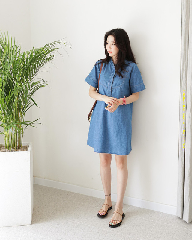 Chiếc đầm sơ mi denim và dép quai mảnh cho cô nàng cổ điển là sự kết hợp hoàn hảo.