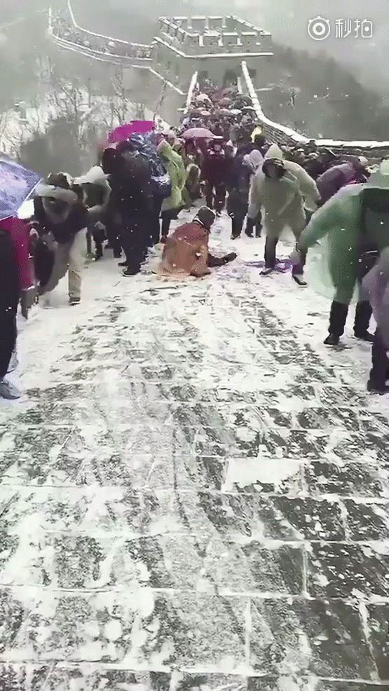 Đoạn video ghi lại cảnh du khách đua nhau ngã nhoài khiến ai cũng phải bật cười. Được biết, họ đi tham quan Vạn Lý Trường Thành đúng dịp bão tuyết. Gió lớn đã khiến họ không thể kiếm soát được cơ thể của mình.