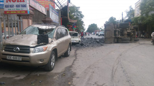 Do bị mất cân bằng, xe tải do ông Tiến điều khiển bị đổ ngang ra đường, đá xanh văng ra, bắn vào xe ô tô Toyota 7 chỗ và xe ô tô Kia Morning đang đỗ ở lề đường ngược chiều.