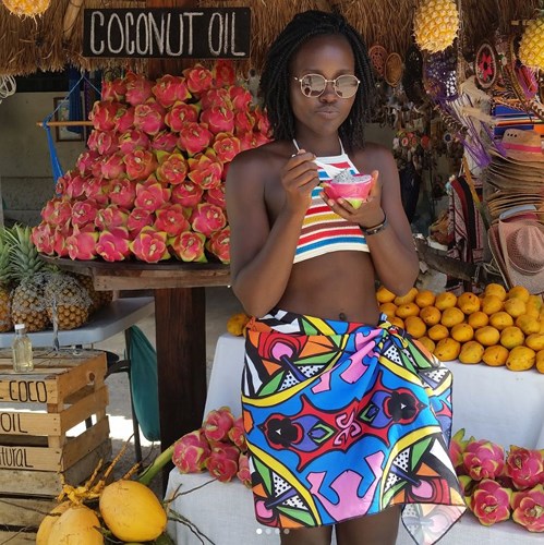 Lupita Nyong đem lại những sắc màu tươi mới của mùa hè đến bãi biển trong bộ áo tắm này của hãng Shoshana./