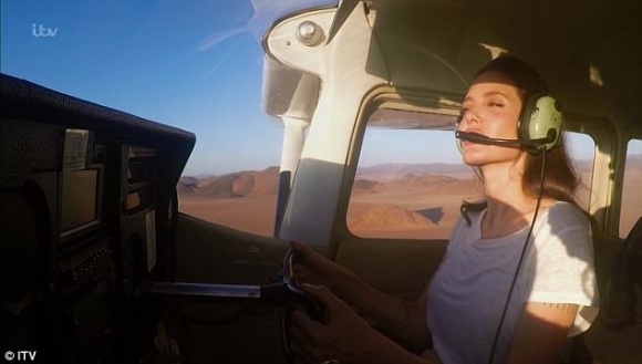 Hình ảnh nữ diễn viên Angelina Jolie tự tin lái phi cơ dạng nhỏ trên vùng sa mạc của Namibia.