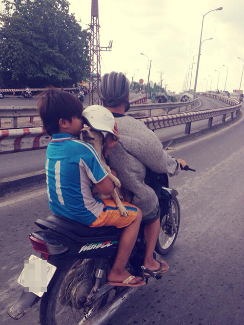 Hình ảnh đẹp này được thành viên Truong Le đăng tải trên mạng xã hội. Kèm theo đó là dòng chia sẻ: "Xe chở về hướng cầu Nhị Thiên Đường thì chắc là đi thú y quận 8. Đang chạy thì mưa ào xuống. Cậu bé rối quá không biết sao bèn cởi nón bảo hiểm của mình đang đội che cho con chó. Chuyện này ông bố không biết, chỉ có cậu, con chó và tui chạy xe kế bên biết thôi!