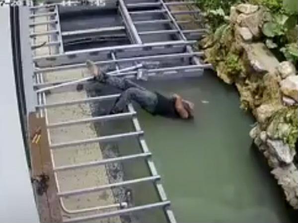Ngay sau đó một người đàn ông khác xuất hiện để xem tình hình nhưng khi chạm vào giàn sắt thì bị điện giật té ngã. May mắn là anh đã nhanh chóng gạt dây điện khỏi giàn sắt nên không bị giật chết.
