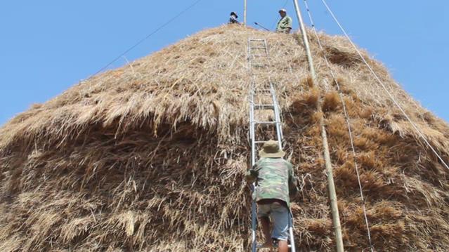 Để làm cây rơm phải nối thang leo lên cao và sử dụng ròng rọc vận chuyển rơm