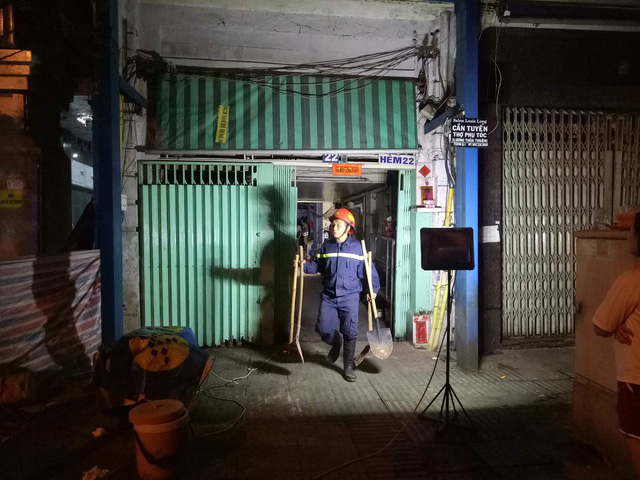 Các chiến sĩ PCCC TPHCM dùng xẻng để mở lối vào.