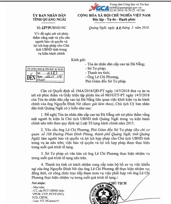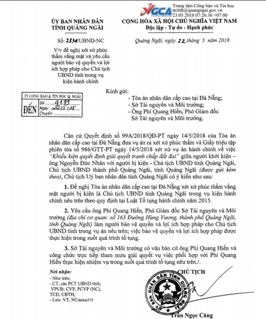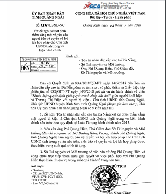 Trước đó, vào ngày 22.5.2018, ông Căng cũng ký công văn gửi TAND cấp cao tại Đà Nẵng đề nghị xét xử phúc thẩm vắng mặt và yêu cầu người bảo vệ quyền và lợi ích hợp pháp cho Chủ tịch UBND tỉnh.