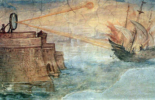 Chiếc gương này hấp thụ và tập trung ánh sáng Mặt Trời vào tàu chiến của quân địch khiến chúng bốc cháy. Ảnh: Science Photo Library