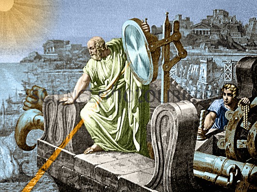 Các sử gia của Hy Lạp và La Mã cổ đại đã ghi chép lại rằng, trong các cuộc bao vây thành Syracus trong Chiến tranh Punic II, nhà phát minh lỗi lạc người Hy Lạp Acsimet đã phát minh ra một chiếc gương để chiếu sáng và đốt cháy tàu thuyền chiến của quân La Mã đang neo đậu trong tầm tên bắn.