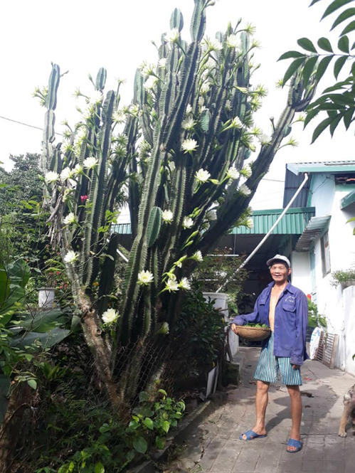 Tài khoản Hang Pham (Cẩm Phả, Quảng Ninh) vừa chia sẻ lên mạng xã hội những hình ảnh về cây hoa xương rồng khổng lồ đang nở hoa rực rỡ. Cô viết: "Cây xương rồng nhà mình trồng gần 30 năm nay rồi. Mỗi mùa ra hoa là ong bay đến đậu quanh luôn. Hoa của nó chỉ nở vào sáng sớm tới 9h sáng là tàn rồi. Hôm nay là một đợt hoa đấy các bạn nhé. Nghe tin cây ra hoa mình phải phi vội về nhà để chụp lại. Nhìn hoa mà lòng ngất ngây".