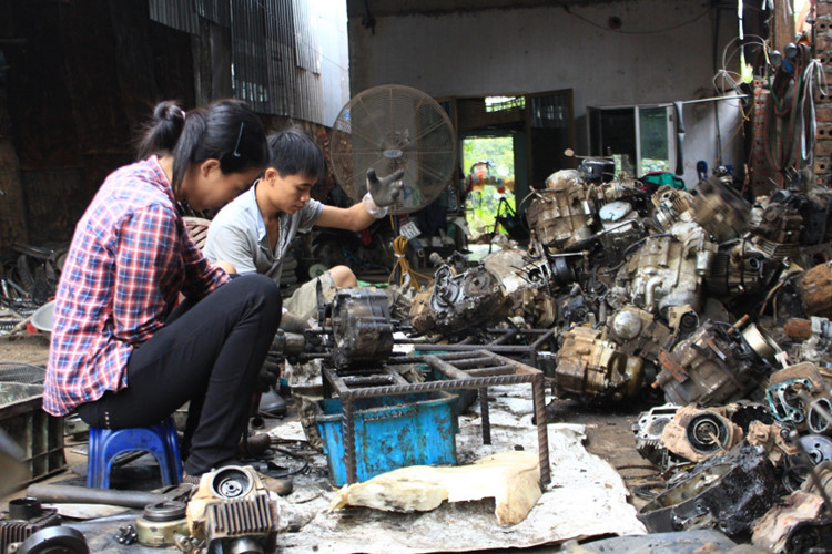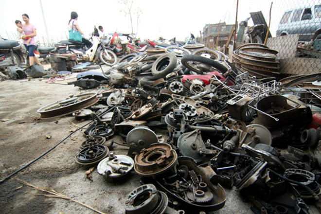 Những thứ còn dùng được, người thợ sẽ "mông má" lại rồi bán cho các cơ sở sửa chữa xe máy. Những bộ phận như vành, nan hoa, khung sắt, lốc máy...thì được bán cho các đại lý nhựa tái chế. Ảnh: Việt Nam Mới.