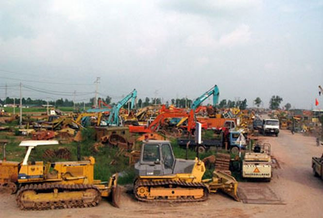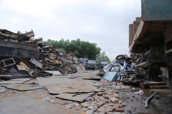 Bãi “mổ” xe nào cũng ngồn ngộn sắt thép, hai bên đường chất đống ngổn ngang ôtô, xe máy, máy xúc, máy ủi các loại… Cả ngàn chiếc xe mang đủ biển số từ Bắc chí Nam… Ảnh: Tiền Phong.