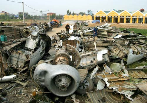 Chỉ bằng những công cụ thô sơ như búa đục, cuốc chim và xà beng hay hiện đại lắm là chiếc đèn khò, những chiếc máy bay đã được những "thợ xẻ" (những người tháo dỡ các chi tiết máy bay) phân loại đâu ra đấy nhiều nhất vẫn là nhôm, được đưa vào lò đúc thành khối hoặc đúc ngay thành nồi ngay tại làng. Ảnh: Báo Bắc Ninh.