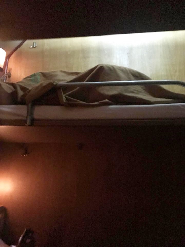 “Nhìn cái giường có hơi bị lõm không nhỉ? Vì có tận 2 người nằm ở đó. Đây là giường nằm, tàu NA1, chạy lúc 10h45 ngày 10/7/2018, toa 3, giường số 15-16.