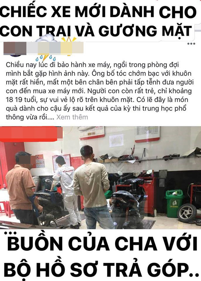 "Chiều nay lúc đi bảo hành xe máy, ngồi trong phòng đợi mình bắt gặp hình ảnh này. Ông bố tóc chớm bạc với khuôn mặt rất hiền, mất một bên chân bên phải tấp tễnh đưa người con đến mua xe máy mới. Người con còn rất trẻ, chỉ khoảng 18 19 tuổi, sự vui vẻ lộ rõ trên khuôn mặt.