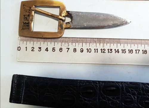 Dây thắt lưng được chế tác thành dao găm bị an ninh hàng không thu giữ. Ảnh: Hữu Nguyên.