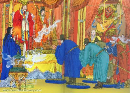 Nguy Trung Hiền (áo đỏ, mũ vàng) trong buổi lên triều. Ảnh: Discovery Oriental