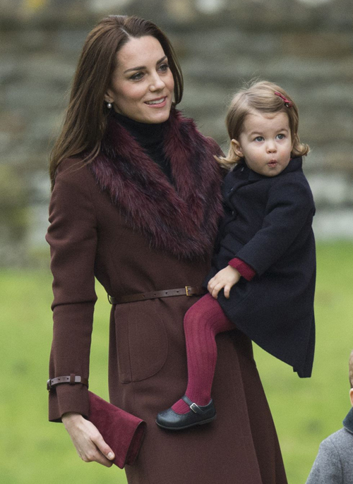 Đây là hình ảnh vào Giáng sinh năm 2016, Công nương Kate, Hoàng tử Will và hai con đã tới nhà thờ cùng gia đình Middleton tại Englefield, Anh. Cả Kate và Charlotte đều trông thật ấm áp trong sắc đỏ rượu vang.