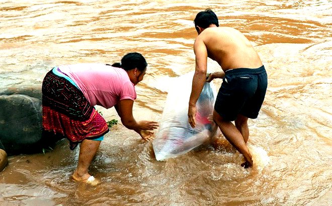 Còn tại bản Huổi Hạ (Na Sang, Mường Chà, Điện Biên) là một trong những bản xa xôi và nghèo khó nhất của xã Na Sang. Do đang vào mùa lũ, nước suối Nậm Chim (rộng hơn 20 mét) lên cao khiến nhiều học sinh phải chui vào túi nylon và nhờ người lớn vừa bơi trong dòng nước lũ vừa kéo qua suối để kịp đến trường.