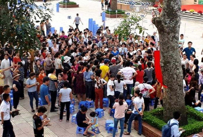 Phụ huynh vây kín sân trường chiều 4 Tháng Chín đến hơn 18 giờ vẫn chưa giải tán (Hình: Facebook Hà Phượng)