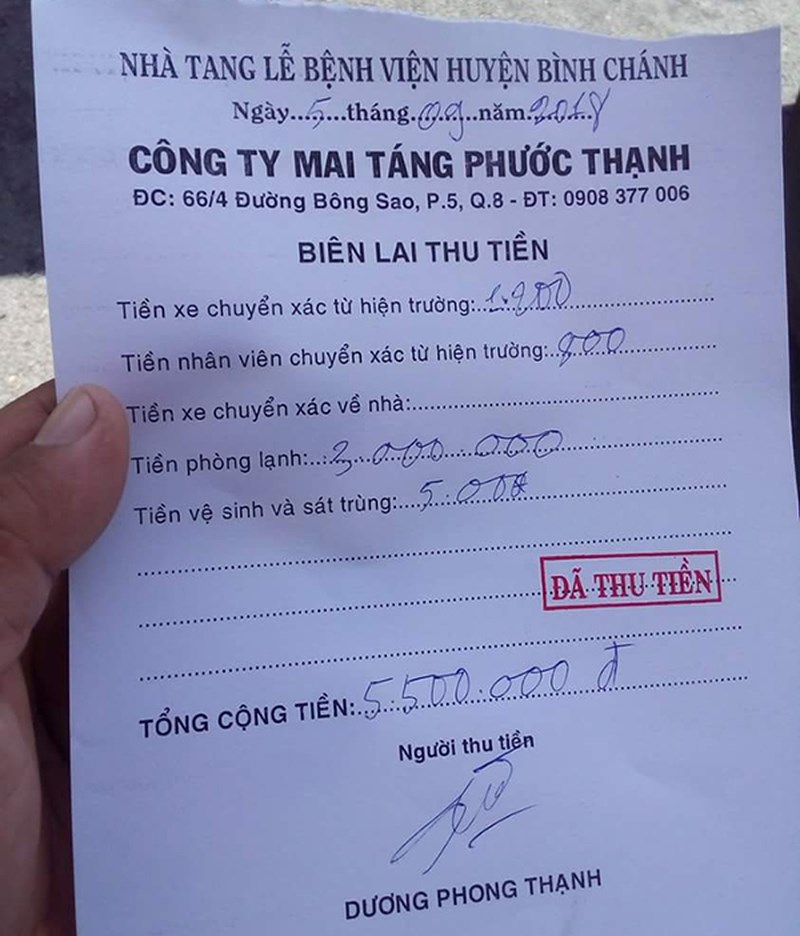 Theo ông L., khoảng 13 giờ 30 ngày 5-9, CQĐT khám nghiệm tử thi xong và cho phép người nhà đưa nạn nhân về quê mai táng. Lúc này, bảo vệ nhà tang lễ đưa cho gia đình nạn nhân biên lai thu tiền. Biên lai thể hiện những khoản tiền gia đình nạn nhân phải đóng gồm tiền xe chuyển xác từ hiện trường (1,2 triệu đồng), tiền nhân viên chuyển xác từ hiện trường (800.000 đồng), tiền phòng lạnh (3 triệu đồng), tiền vệ sinh và sát trùng (500.000 đồng). Tổng cộng các khoản là 5,5 triệu đồng. Người thu tiền ghi tên Dương Phong Thạnh.