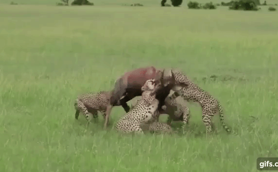 Năm con báo săn đã bắt được một con linh dương to lớn và đang dùng hết sức lực để ghì chặt con mồi, chúng quyết tâm không để nạn nhân có cơ hội trốn thoát. Tuy nhiên những nỗ lực này đã đổ xuống sông xuống bể chỉ vì một bất ngờ xảy ra.
