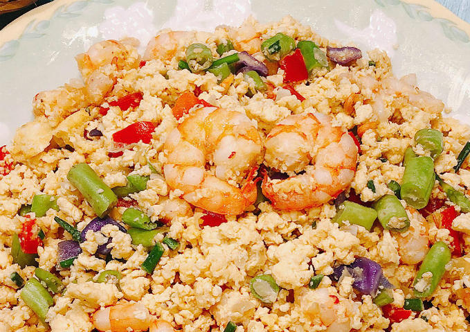- Cho ít dầu ăn vào chảo thêm hành củ băm vào phi thơm cho tôm vào xào chín, tiếp là đậu que và ớt chuông vào xào thêm ít phút. Cho trứng vào dùng đũa đánh cho trứng tơi ra đến khi trứng chín thì tắt bếp. Món ăn dùng chung với cơm.
