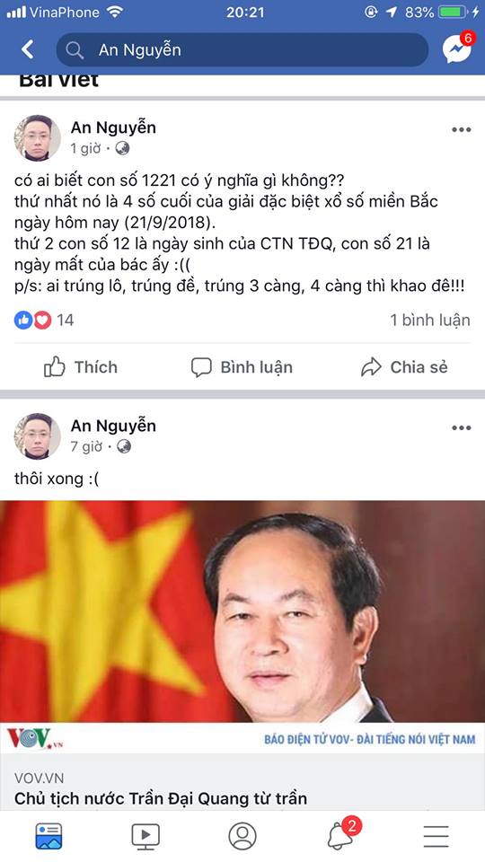 Đúng ra hôm nay ngày 21/9/2018 là một ngày đau buồn của nước Việt Nam khi Chủ tịch nước Trần Đại Quang qua đời vì căn bệnh hiếm gặp. Trên mạng, ngoài những lời bày tỏ thương tiếc trước sự ra đi của Chủ tịch nước. Cộng đồng mạng còn đang đua nhau đánh đề ngày Chủ tịch nước mất.