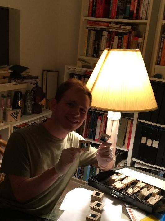 Anh Aaron Tock cầm những tấm hình Sài Gòn năm 1967 do ông ngoại mình chụp. (Ảnh: Aaron Tock cung cấp)