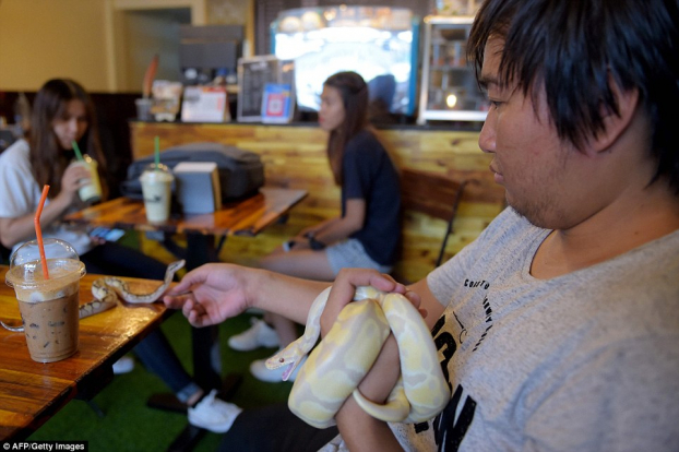 Sau khi rộ lên phong trào cà phê chó, mèo, giờ đây có thêm một mô hình cà phê mới xuất hiện: cà phê bò sát. Khi vào quán, khách hàng có thể vừa thưởng thức đồ uống, vừa chơi đùa với rắn, trăn hay thằn lằn...