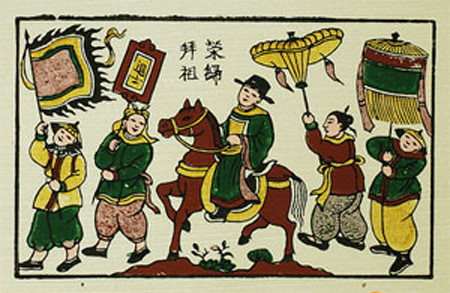 Vinh quy bái tổ. Tranh dân gia Đông Hồ.