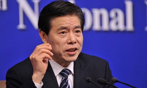 Bộ trưởng Thương mại Trung Quốc Chung Sơn trong cuộc họp báo bên lề Kỳ họp thứ nhất Quốc hội Trung Quốc khóa 13 hồi tháng 3. Ảnh: Reuters.