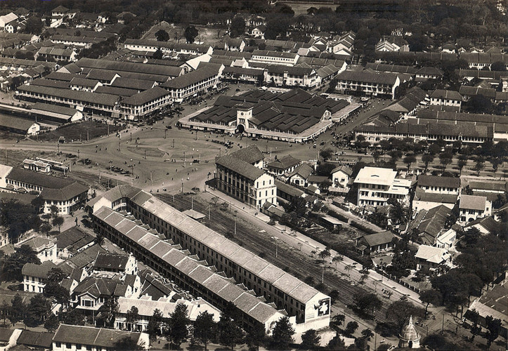 Khu vực chợ Bến Thành thập niên 1920. Ga Sài Gòn thời điểm này nằm ở phía trái, cạnh bùng binh chợ Bến Thành. Trước đó, trong giai đoạn 1885 - 1915, ga nằm ở bờ sông Sài Gòn, phía cuối đường Hàm Nghi. Ảnh tư liệu.