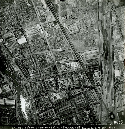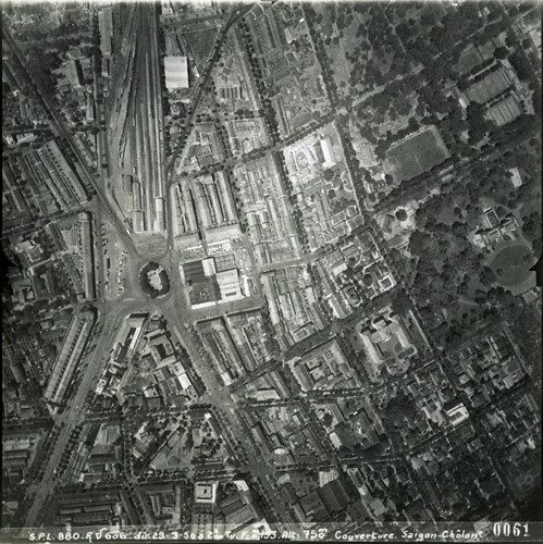 Bức không ảnh này bao quát gần trọn vẹn phạm vi ga Sài Gòn (bên phải) năm 1950. Ngày nay, phần đất ga là công viên 23/9. Ảnh tư liệu.