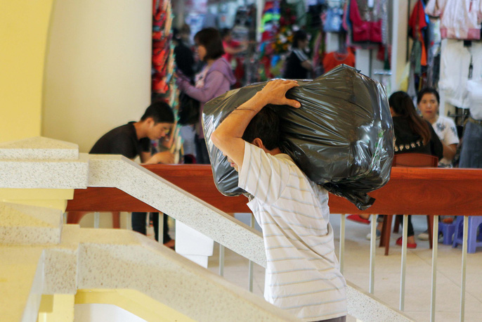 Đội khuân vác của các chủ sạp hàng liên tục bốc dỡ hàng hóa từ chợ tạm sang ngôi chợ mới sửa khang trang hơn.