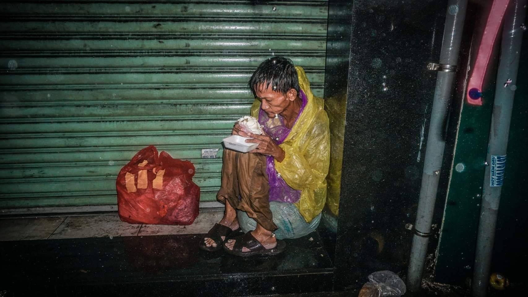 “Nhìn chú ăn mà con muốn khóc luôn… Thương chú quá… Chú ơi… Mình kiếm chỗ nào nghỉ chân cho qua đêm nay đi, bão đang lớn lắm, nguy hiểm lắm. Con thương chú quá..” - tài khoản Max Nguyễn chia sẻ.