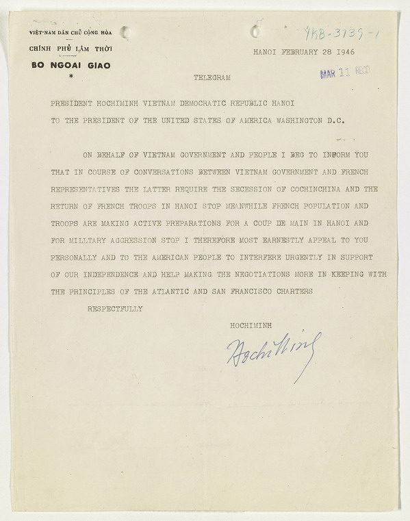 Vietbf.com Vì sao Hồ Chí Minh gửi thư mong muốn làm "chư hầu" cho Mỹ nhưng tổng thống Mỹ không thèm trả lời. Trong lịch sử cận đại VN có 1 sự kiện được nhắc đến nhiều, nhưng chứa 1 bí ẩn lớn, chưa thấy ai công bố lời giải. Sự kiện là vào năm 1945-46 Chủ tịch Hồ Chí Minh nhiều lần gửi thư cho Tổng thống Mỹ nhưng không nhận được trả lời. Bí ẩn là lý do của sự việc không trả lời đó. Đây thuộc vấn đề biết kết quả, cần tìm và giải thích nguyên nhân.