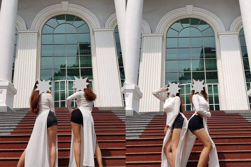Thay vì cách kết hợp trang phục áo dài truyền thống, hai nữ sinh lại “phá cách” phản cảm với quần đùi và tạo dáng gây bức xúc.