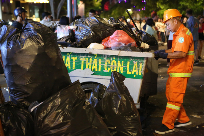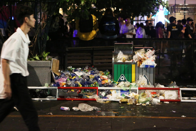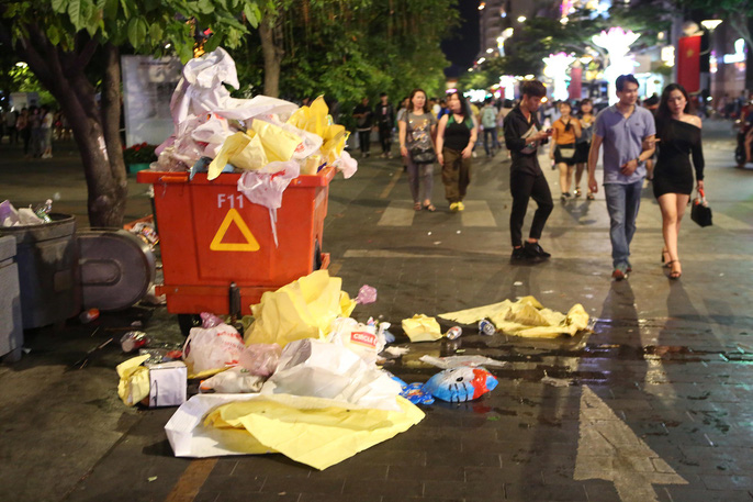 Theo ghi nhận của phóng viên, tại phố đi bộ Nguyễn Huệ, những thùng rác được bố trí dọc hai bên nhưng không chứa hết lượng rác thải mà người đi xem pháo hoa để lại.
