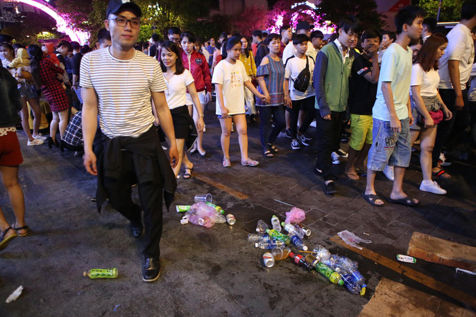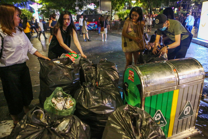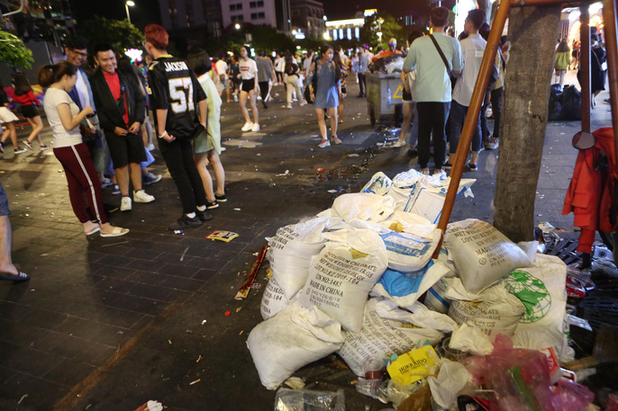 Từ đêm 31-12 đến rạng sáng 1-1, rất đông người dân TP HCM đã tập trung tại những tuyến đường trung tâm TP như phố đi bộ Nguyễn Huệ, đường Tôn Đức Thắng, bờ sông Sài Gòn để theo dõi thời khắc bắn pháo hoa kéo dài trong 15 phút. Sau khi kết thúc màn pháo hoa, người dân ra về để lại rác, nylon, vỏ chai... trên những mặt đường mà họ từng ngồi. Nhiều nhóm bạn trẻ đã tình nguyện cùng nhân viên vệ sinh vất vả dọn rác thải.
