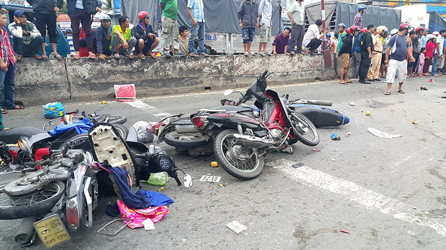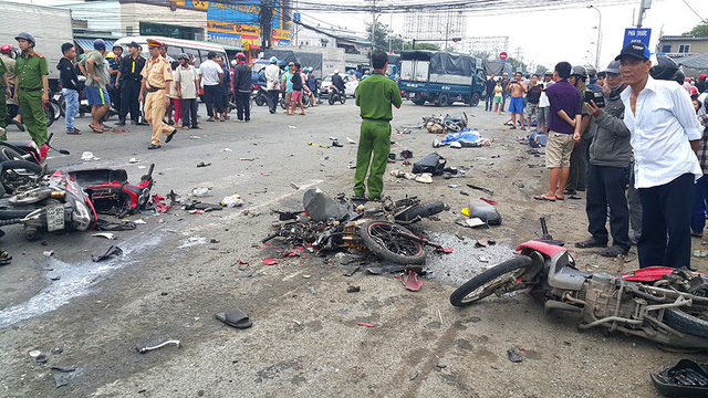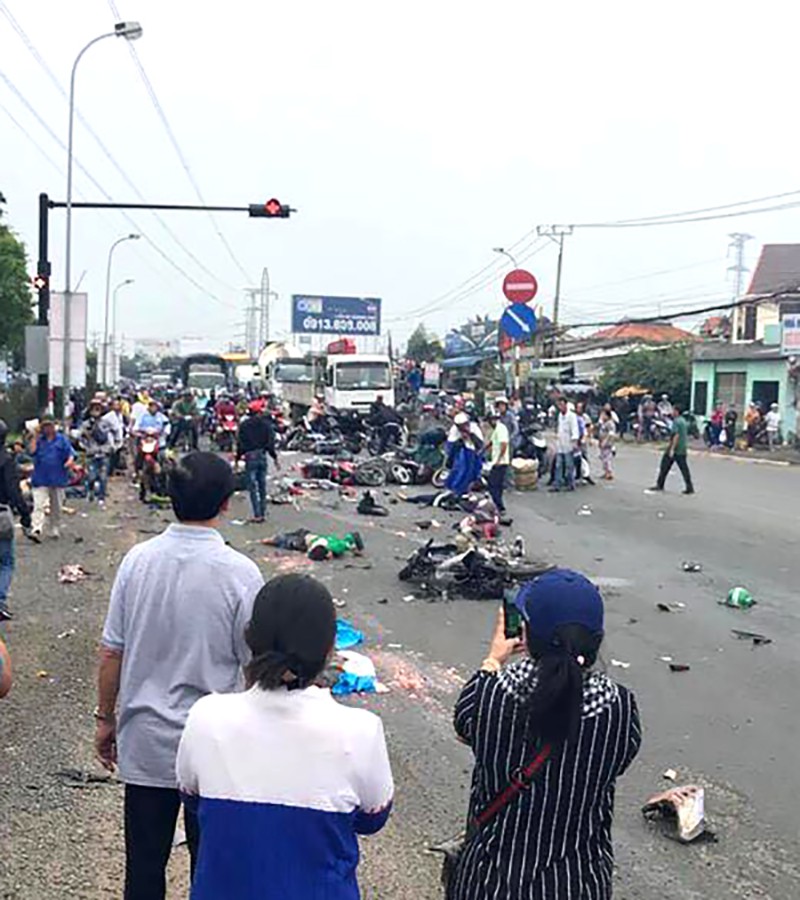 Hiện trường vụ xe bồn lao vào nhóm xe máy dừng chờ đèn đỏ khiến 16 người thương vong.