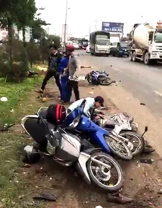 Xe máy và người bị thương nằm la liệt trên đường.