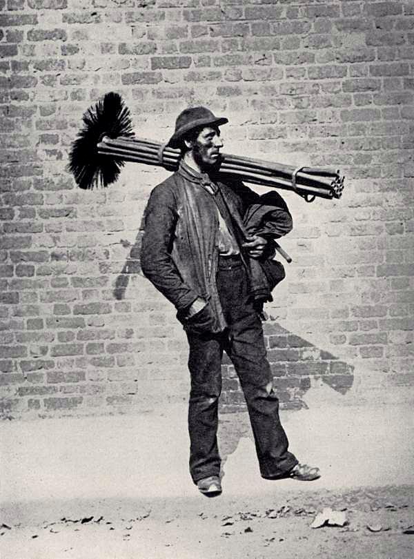 Người thợ vệ sinh ống khói đứng chờ khách tại quận Greenwich (London). Khi công nghệ dọn dẹp chưa hiện đại như ngày nay, lau dọn ống khói vẫn là nghề nghiệp phổ biến.